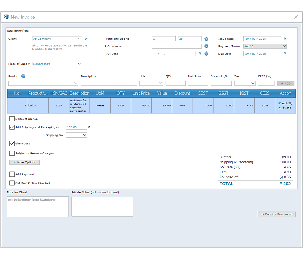 If you click on “Document Preferences” you can change a number of settings, including: Add Shipping Costs, Hide amount due, Show Net Received, Use Indian Formatting, Show Total Before Tax plus others.